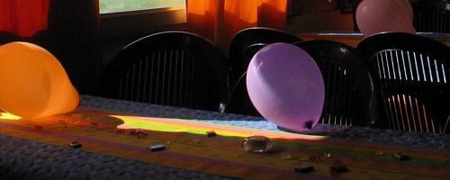 Auf den Tischen liegen Gummibärchen, kleine Täfelchen Schokolade ...
