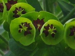 Das runde Grüne sind Hochblätter und die kleinen dunkelroten Sternchen,