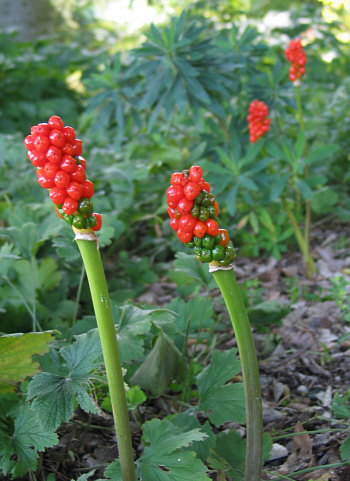 Und drüben unter den Bäumen, da leuchten die Aronstäbe giftig rot-grün: